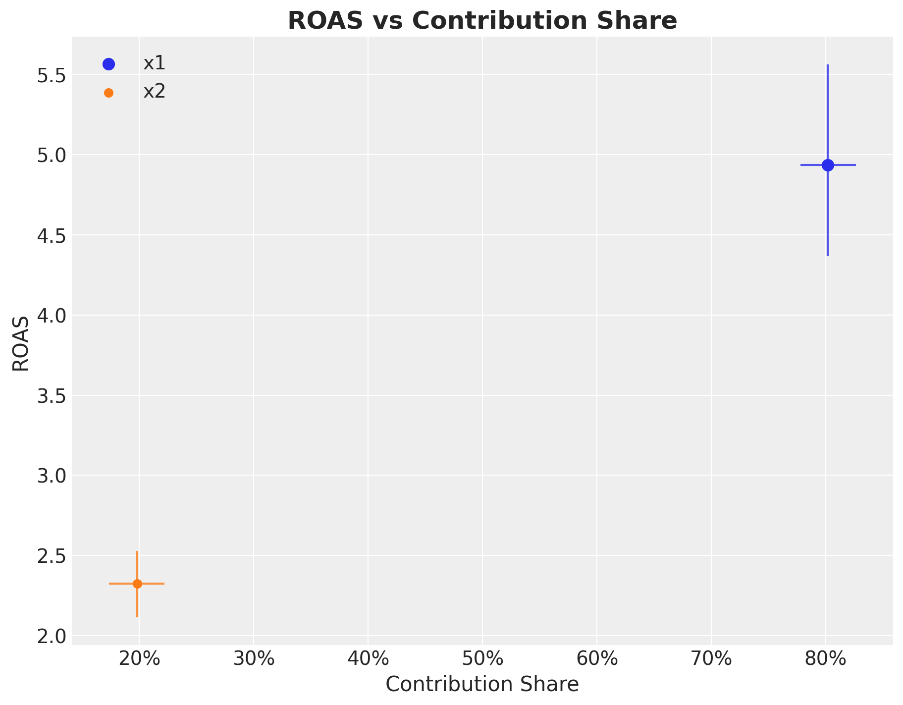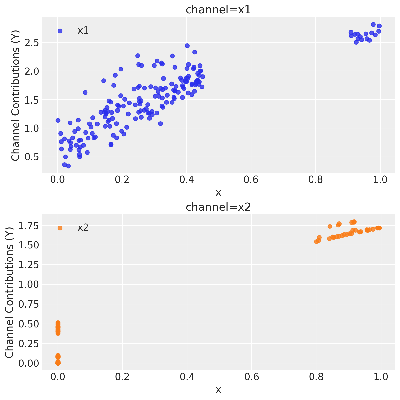 Remark: By design, \(x_{1}\) should resemble a typical paid social channel and \(x_{2}\) an offline (e.g. TV) spend time series.